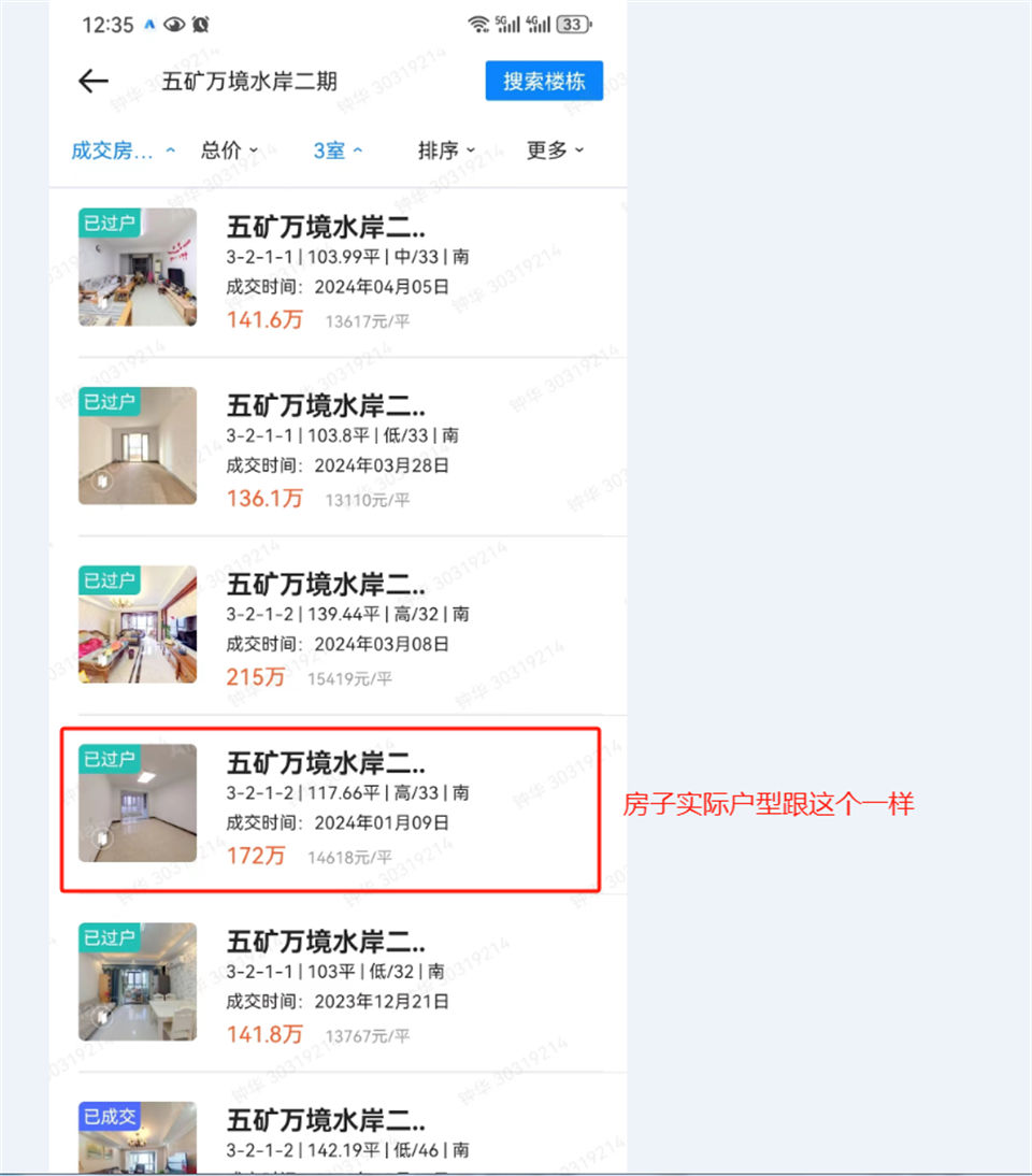 請(qǐng)看圖3 (貝殼二手房的最新成交情況),117平的這個(gè)同戶(hù)型(第4套房),二手房的成交價(jià)是172萬(wàn),咱這套頂樓我給打折30萬(wàn)夠了吧,賣(mài)140萬(wàn)不為過(guò)吧。