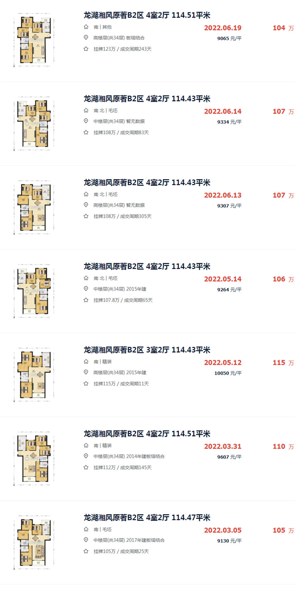 同戶型二手房貝殼最近3個(gè)月成交了7套(圖9,只能說(shuō)龍湖的品質(zhì)真的搶手,二手房?jī)r(jià)格比地鐵口的新奧佳園還堅(jiān)挺),最便宜的是104萬(wàn),常規(guī)樓層的毛坯價(jià)在106萬(wàn)左右。